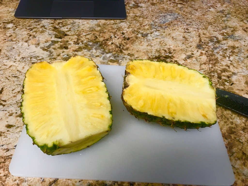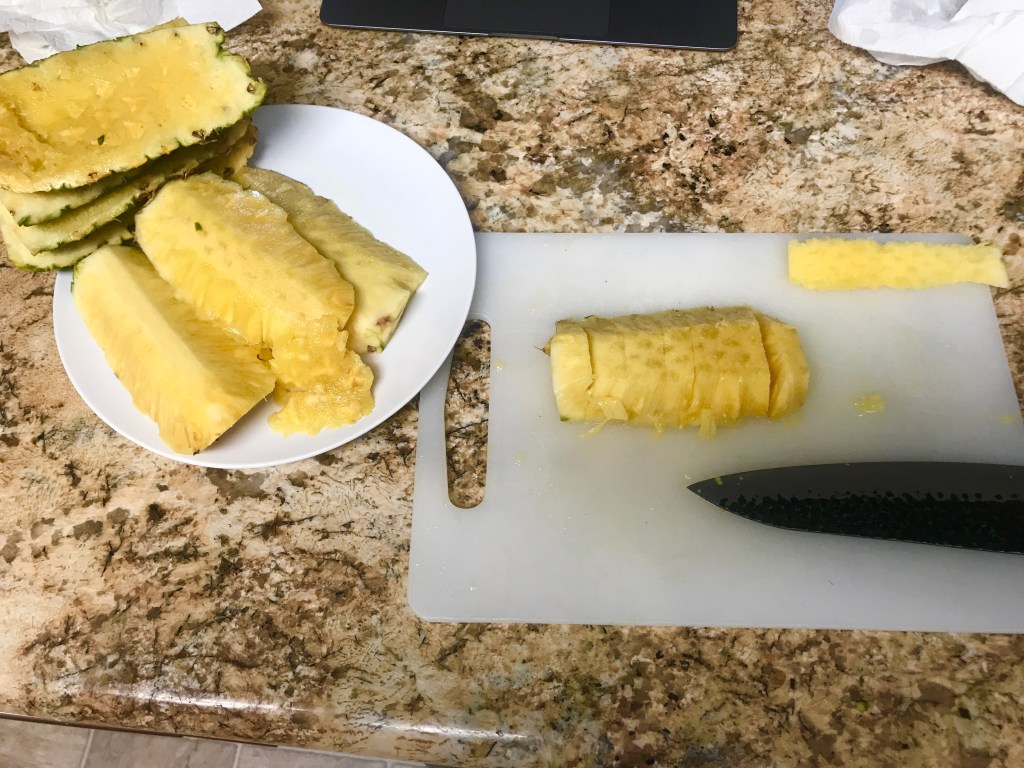 I got started by buying a pineapple. I learned that you can tell when a pineapple is good if you smell the bottom of it and it smells like fresh pineapple. After picking up a good pineapple, I cut it down into chunks by first hacking off the top of the pineapple, then splitting it down the middle lengthwise, then into half again, to have four quarters. I then sliced down the cores off and separated out the fruit meat by cutting underneath the skin.