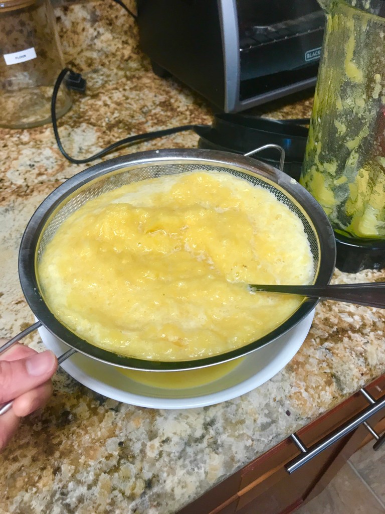 After cutting the pineapple into chunks, I pureed it in my blender with some water. Out of fear of turning it completely into pineapple slush, I avoided puree-ing it completely but in hindsight, I wish I had since I was going to strain out the liquid anyway and it made the jam stringy. After blending the chunks down to a puree, I strained out the juice.