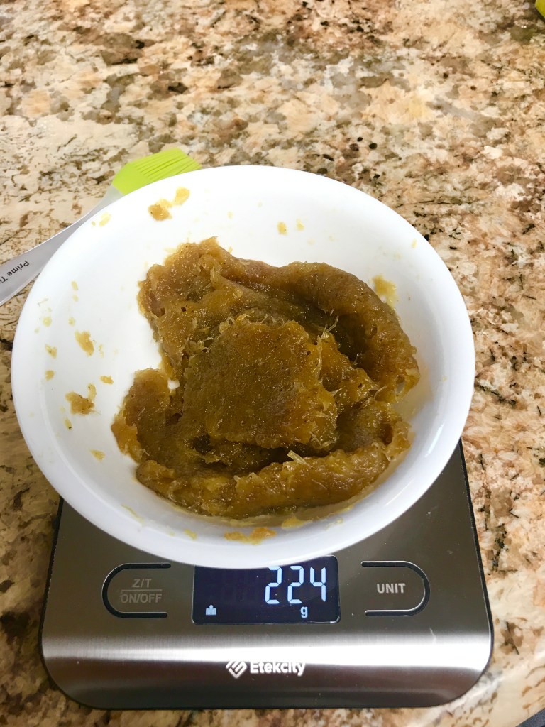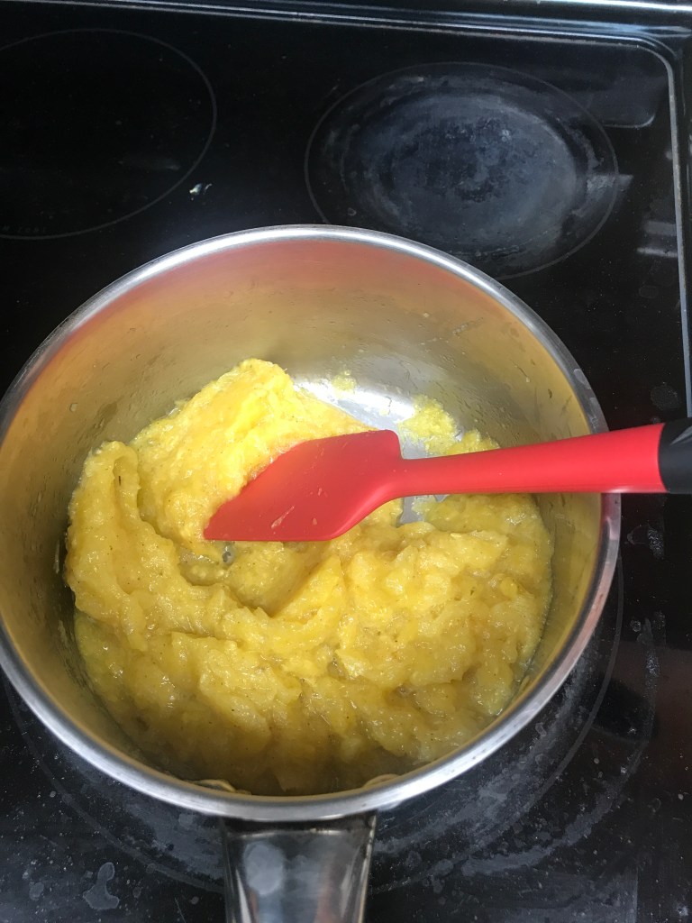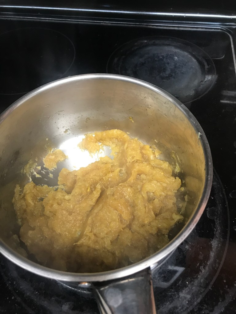 I spent the next hour cooking this down. The pineapple puree slowly thickened, shrunk, and became jam. I was surprised how much it shrunk down from ~1.3 kg to close to ~220g. I mashed it a little bit more into paste form with some pineapple juice before shaping it into little balls and sticking it into the fridge.