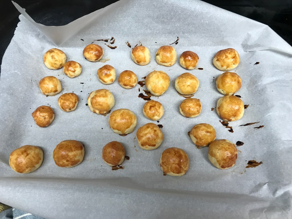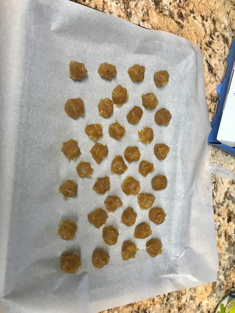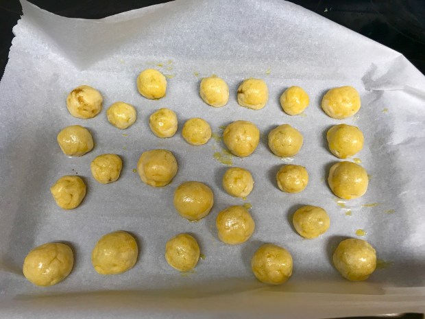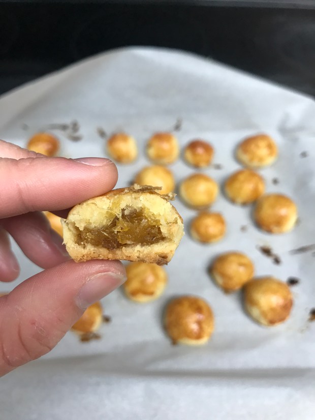 When it came to assembling the balls with the pineapple jam. I flattened each dough ball with my fingers before placing in a small sphere of pineapple jam. However, when trying to close it in, either the dough would crack or it would be too full because the dough balls were too small to really fit a small ball of pineapple jam. While I struggled with closing some of these cookies, I eventually decided to combine some dough balls together to be bigger (~11-12g) to fit the pineapple jam and it seemed to have work. After rolling in the pineapple jam into each dough ball and freezing them. they were baked.