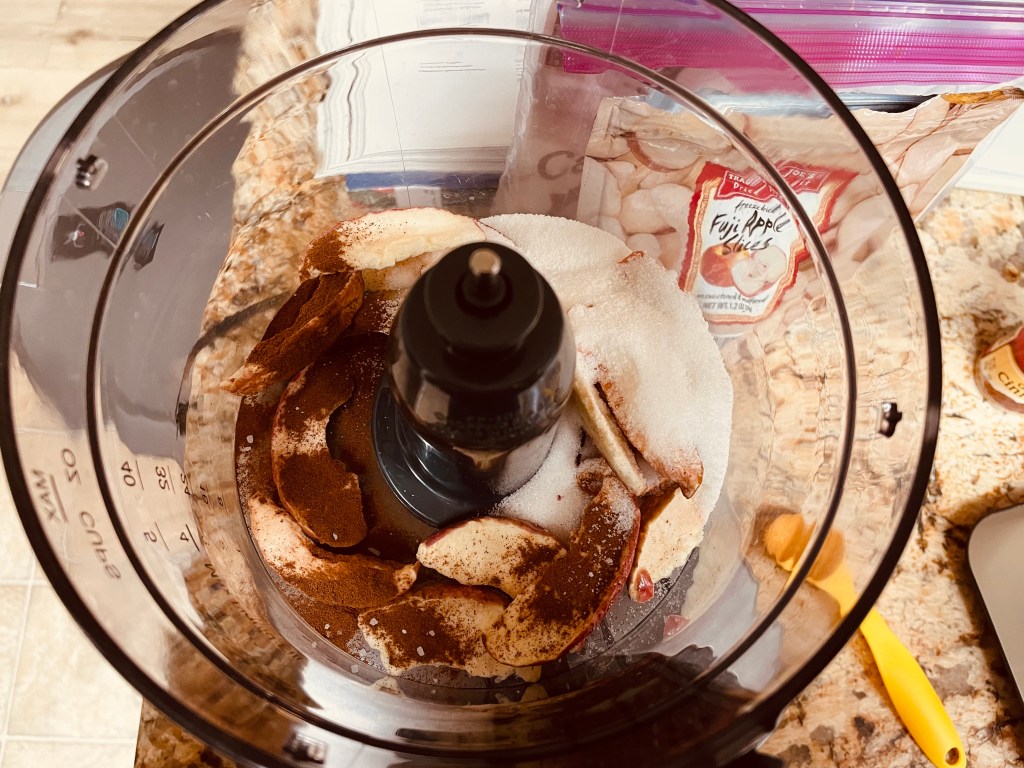 The next day, it was time to prepare the filling. After a quick blitz of a package of freeze dried apples, sugar, and cinnamon, I had a nice batch of apple-cinnamon-y powder. The most time-consuming step was predictably cutting up the apples. Because they were going into a turnover, I had to make them fit by cutting them into small pieces. After peeling and coring two Granny Smith apples, I slice them down the core, cut out the core, and quartered them before slicing them and dicing them into tiny 1/4″ pieces. After tossing it in the apple-cinnamon powder, along with melted butter, brown sugar ( as a substitute for molasses), and lemon juice, I had my apple filling.