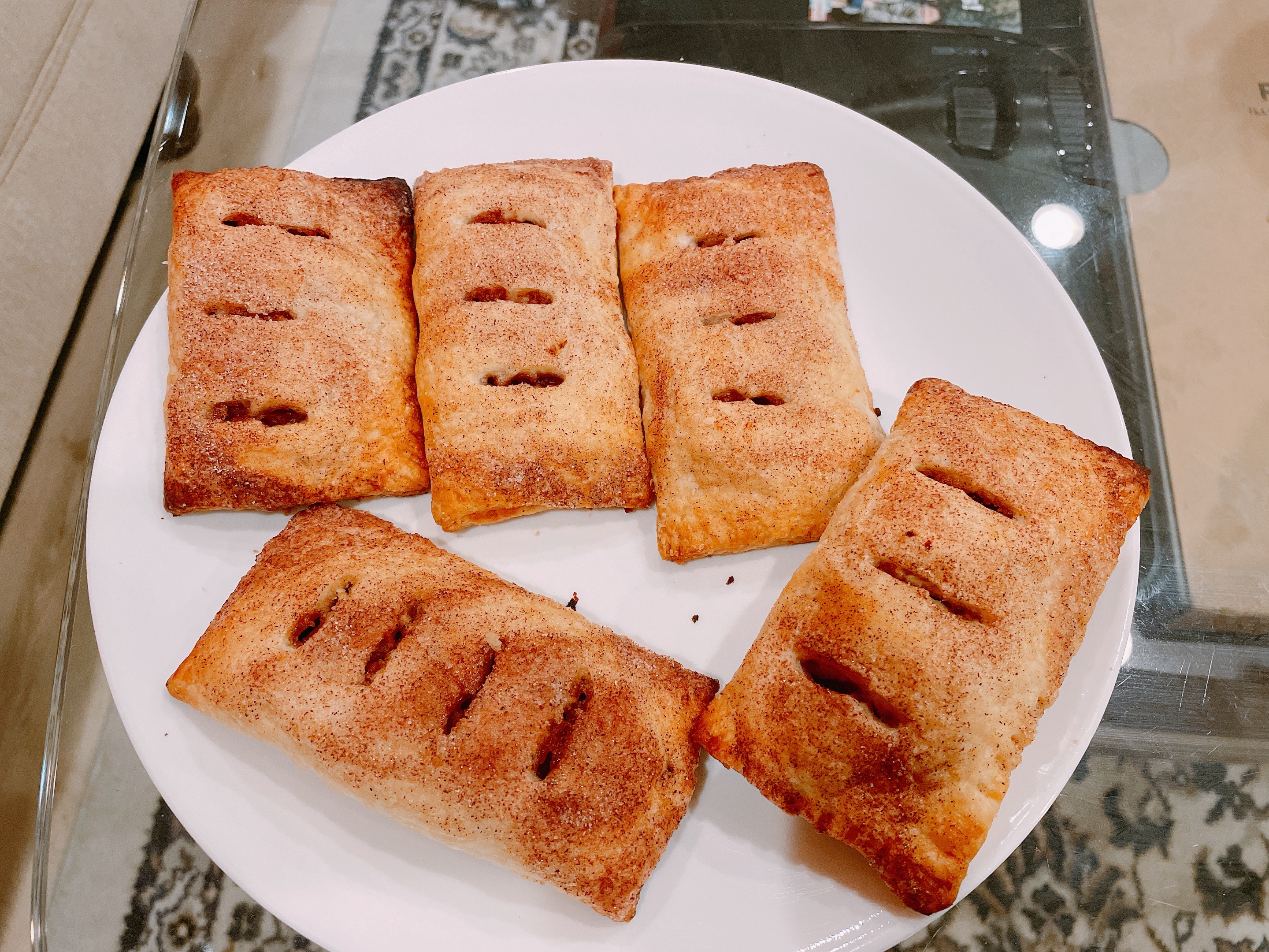 After the chill period, I sprinkled a generous helping of cinnamon sugar on each turnover and cut some decorative slits to make it look like the classic turnover. I then baked them at 400F, closer to 25 minutes than 30 minutes, due to the sugar burning.