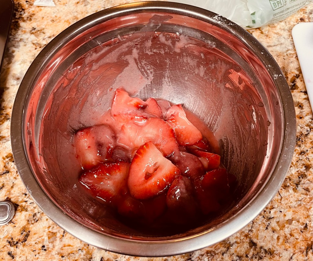 Next step was the filling. What’s pretty cool about this filling is that Stella Parks uses a fixed ratio of fruit:sugar (4:1 oz ratio) with a fixed percentage of 5.5% tapioca starch . As long as you know one amount of something you’ll use, you can easily calculate the amount you need of the other key components. This was the ratio she figured out to have a pie that was not too gloppy and too soggy while still looking juicy and able to retain its shape.