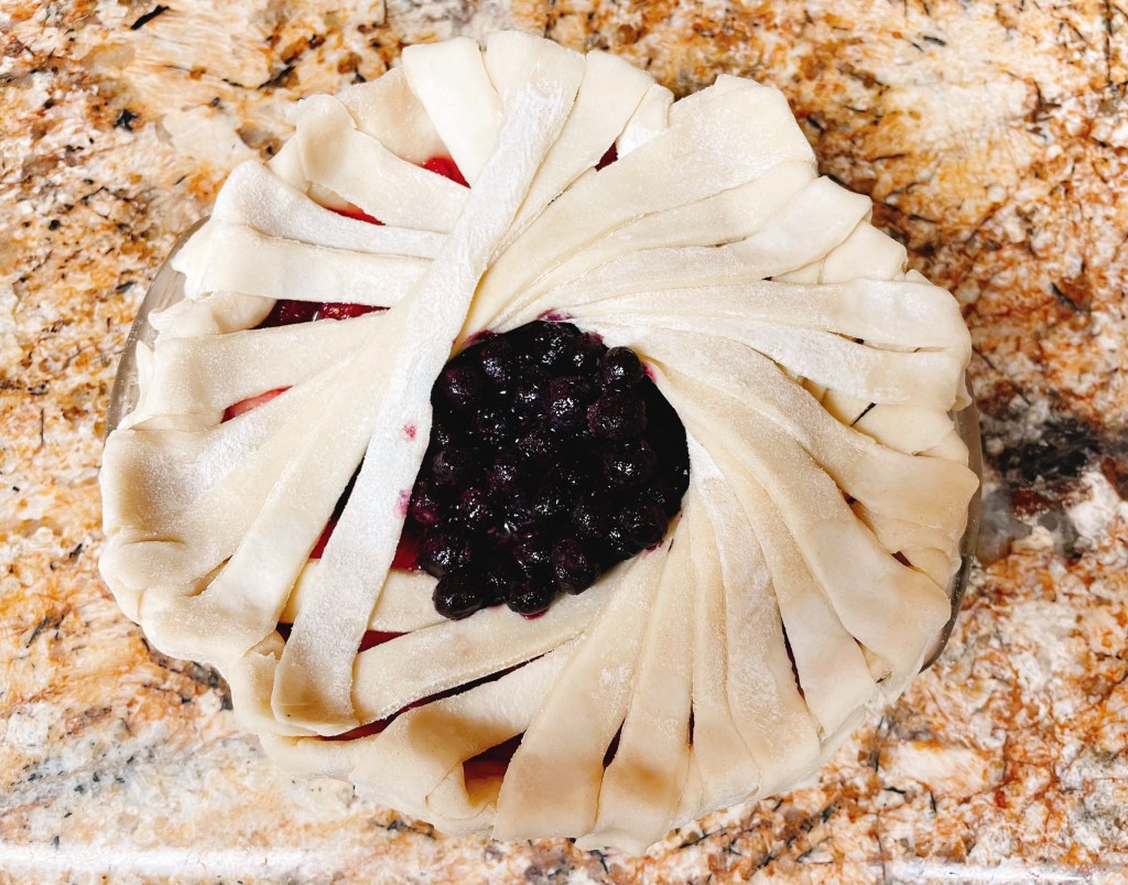 After a quick toss of combining the pie filling ingredients together and placing them in the pie, I was now left with making the pie design. Since I did not have a cookie cutter small enough to fit at the center of the pie, I used a glass cup…which ended up being less than ideal in that because how heavy the glass was, probably in comparison to a cookie cutter. With the help of a roommate who kept the glass in place as it was slowly sinking into the filling, I started laying the 1/4″ strips of dough in a way that grazed against the glass cup and laid slightly on top of each other. The idea was to create an optical illusion of a curving spiral design with a circle hole in the middle.