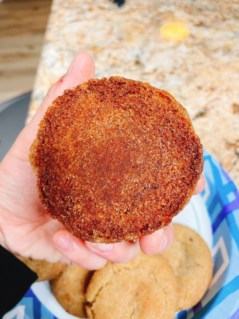 Always as a precaution when making cookies, I always dock off a minute than what was stated in the recipe because I tend to overbake cookies. After baking it at 9-10 minutes at 350F, I took it out. Like a snickerdoodle, the tops looked pale/underdone and cracked but the bottom looked pleasantly brown and formed something like a foot, like what you would see on a macaron. After letting it cool, the cookies firmed up and I was able to spatula the cookies onto a plate.