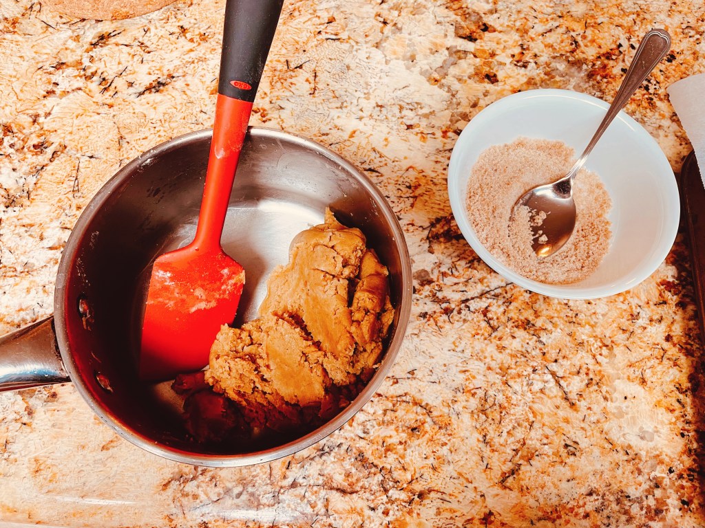 The dough came together pretty straightforward. Interestingly, it all came together in a pot of cooled browned butter, rather than a mixing bowl. I guess it saves me the trouble from having scrape the browned bits into another mixing bowl. I mixed a separate bowl of brown and granulated sugars for rolling.