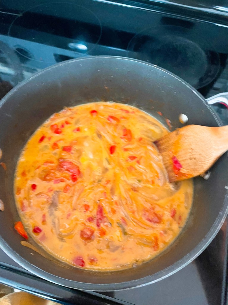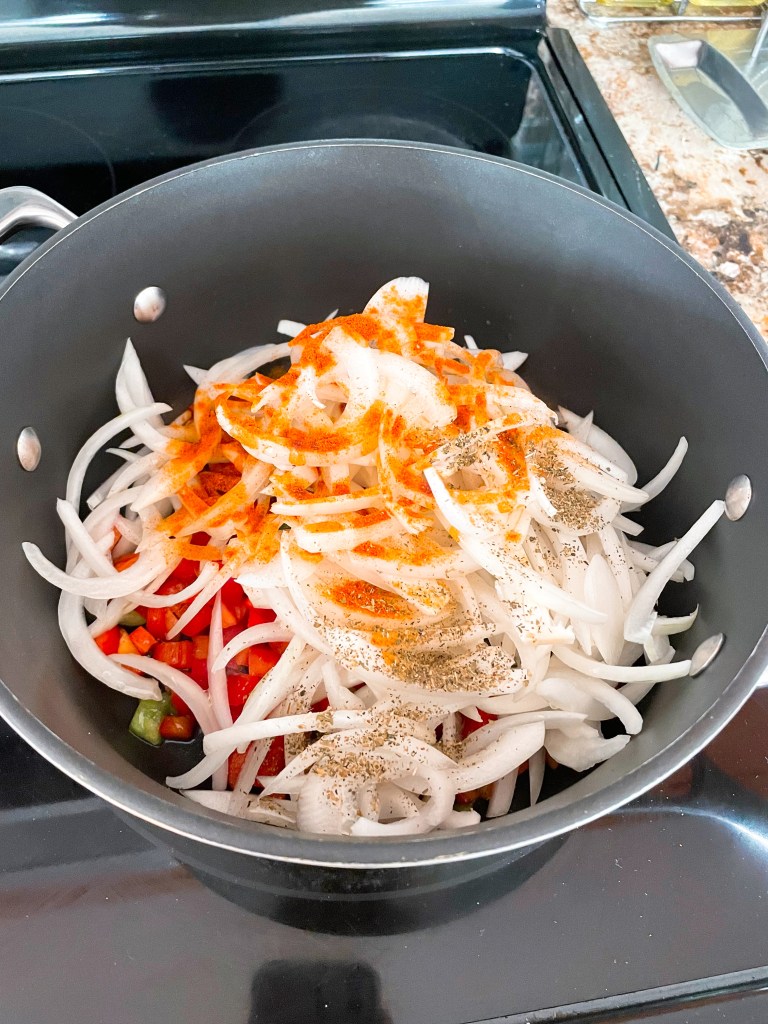 On a nonstick skillet, I cooked the onions/peppers with the spices for about 10-12 minutes over medium heat before adding the tomatoes.