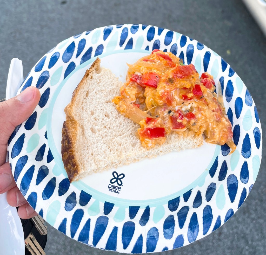 Oh, this was a good breakfast. I was in a rush for a morning meeting so I had to take it to go but as I wolfed it down in the car, I was surprised by how good it was. The oregano/pepper notes and the sweet notes from the vegetables paired well with the sourdough bread. I really like the difference in textures of crunchy/soft.