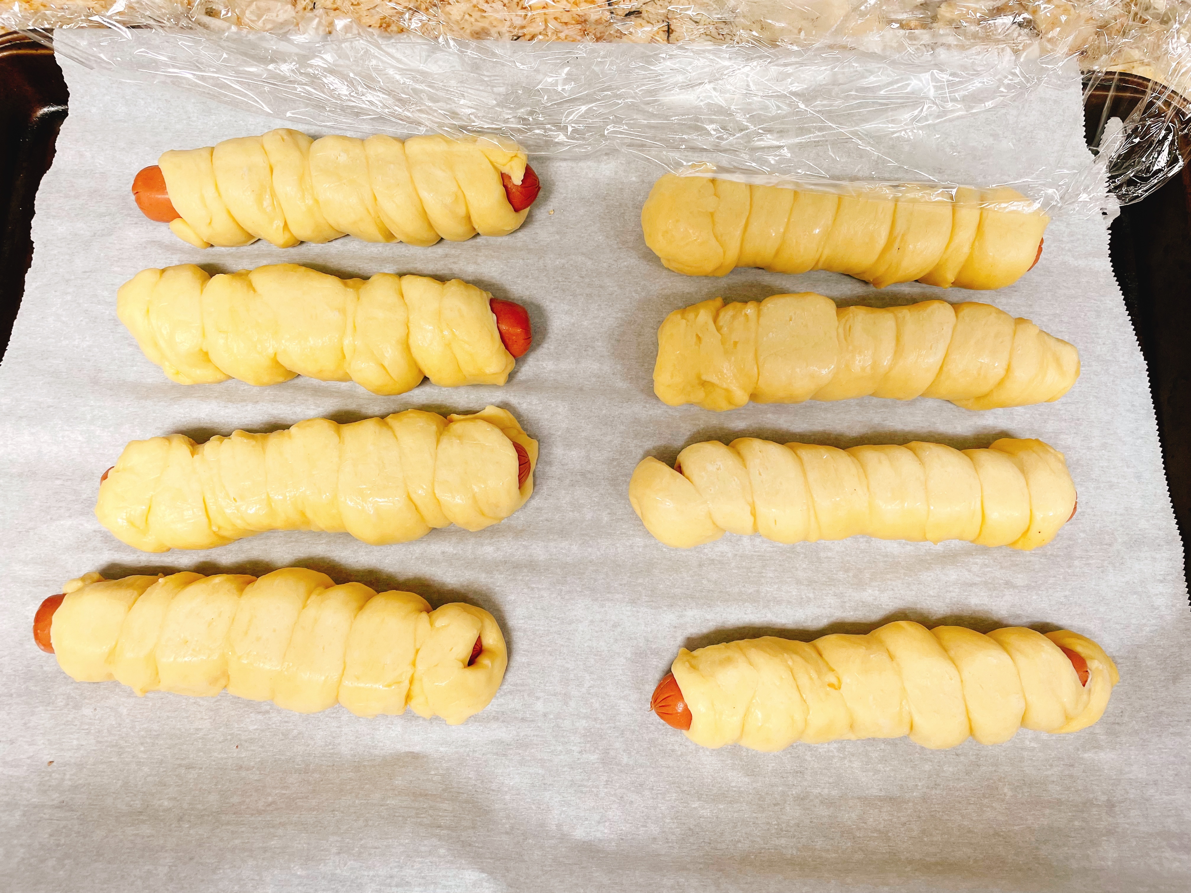 Afterwards, I patted the hot dogs dry with a paper towel and lightly dusted the franks with flour. Starting from the middle, I draped one rope over dog and worked to cover both ends with the dough to the best of my ability.