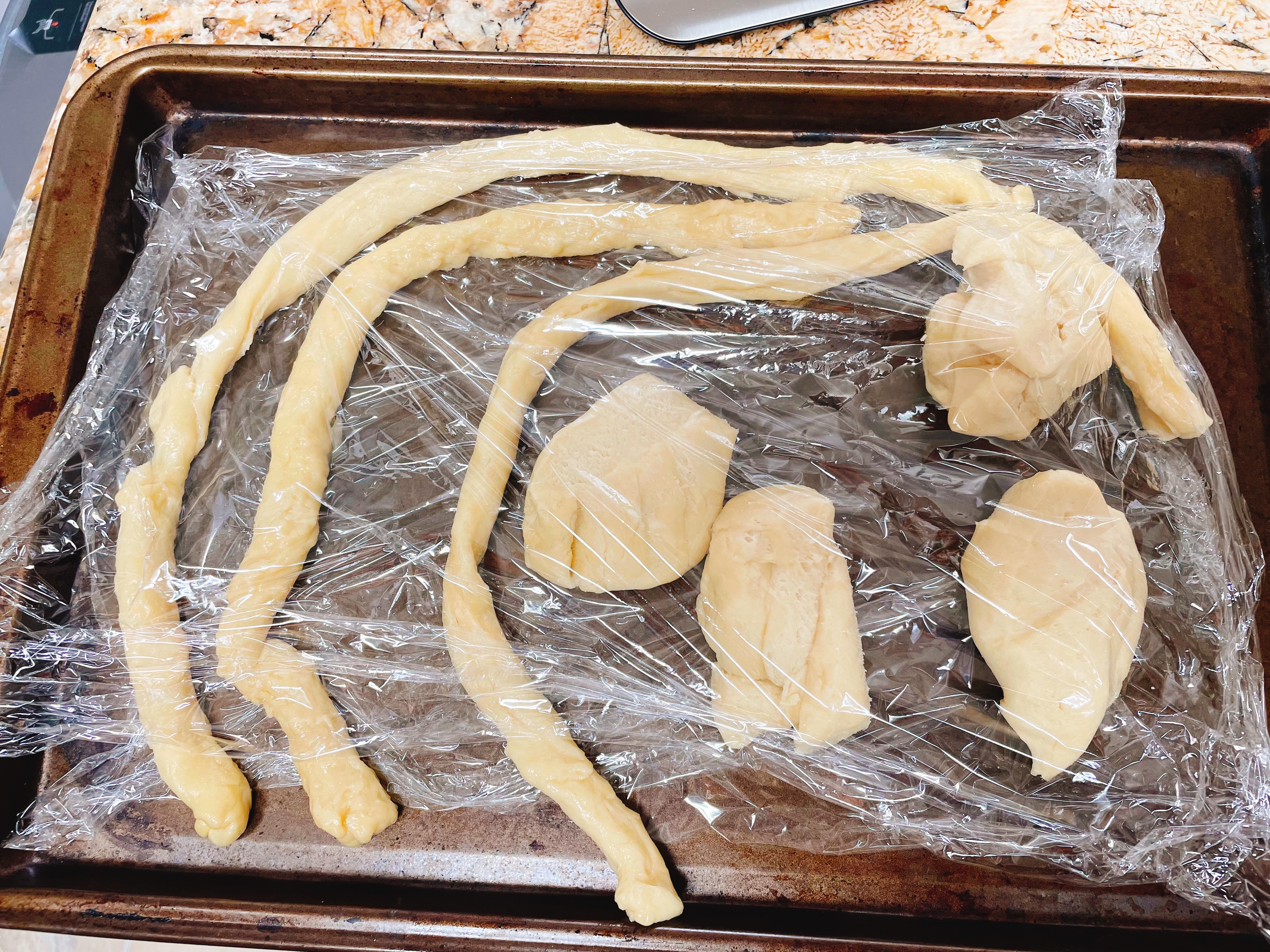 I partitioned the dough in half and worked to divide that half of dough into 64g portions. The idea was to roll out each portion into a thin 20 in rope and wrap it around the dog. As I was rolling it, it got increasingly harder to manage since it was also a warm day and I could feel the butter in the dough melting in my hands as I worked with it. I figured that rolling each piece was going to be tedious and increasingly more difficult as the day got hotter.