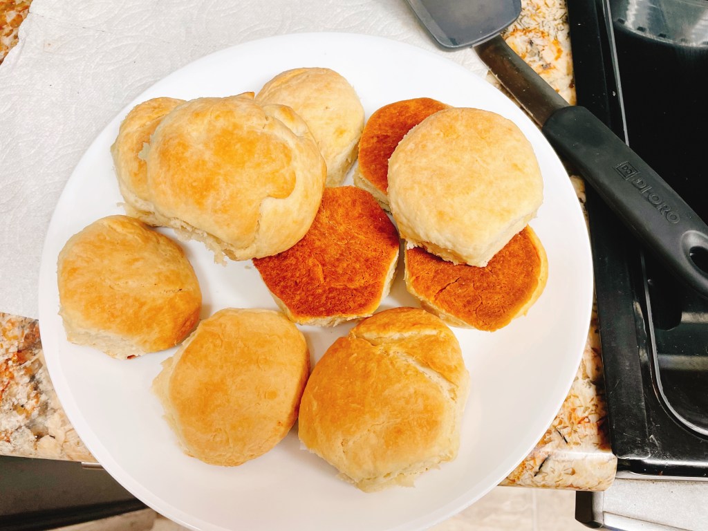 When they came out of the oven, the tops were slightly browned but the bottoms were crisp and thoroughly browned. I separated the biscuits with a spatula and placed them on a plate to cool before cutting into them.