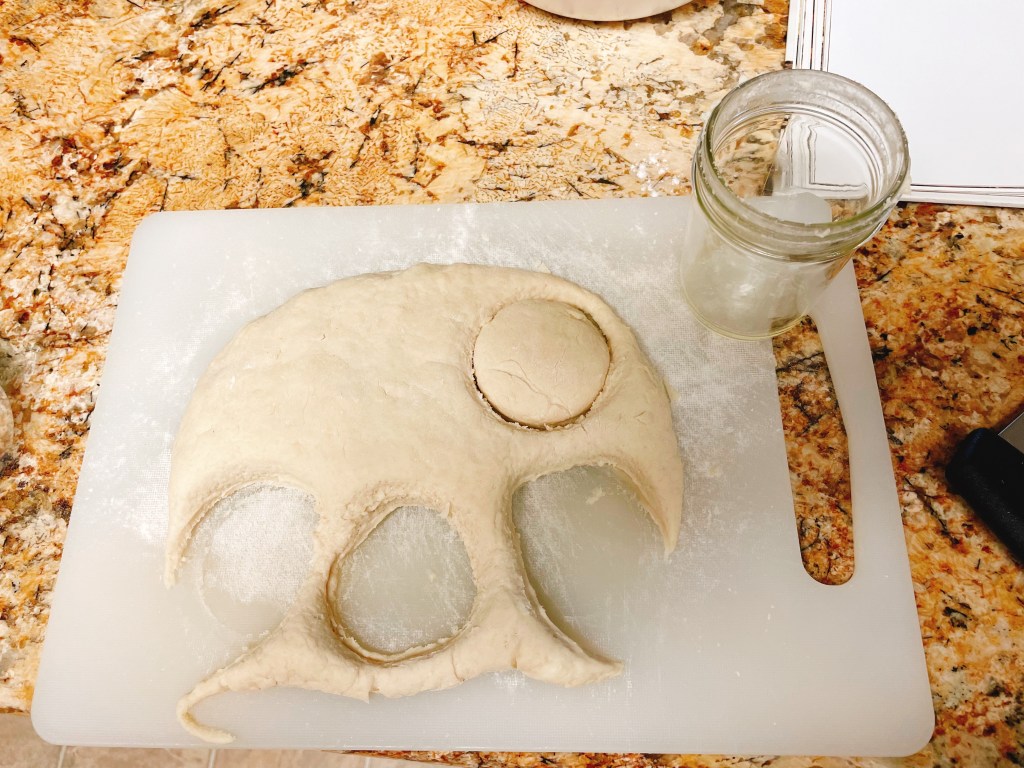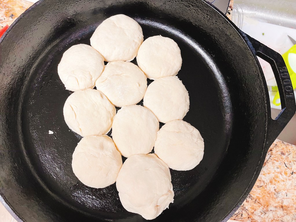Since I didn’t have a 2 1/2″ cookie cutter, I used a small mason jar to cut out the biscuits, making around ten biscuits. I placed the biscuits close to each other in the cast iron, then baked it for around 25-27 minutes.