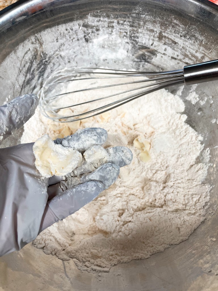 Since I didn’t have buttermilk, I made my own by mixing 1 cup of milk with 1 tbsp of white vinegar and letting it sit and curdle for 10 minutes. I then mixed it in with the flour-butter mixture until the dough came together like a sticky ball. I then folded the the mixture 3 times to create layers.