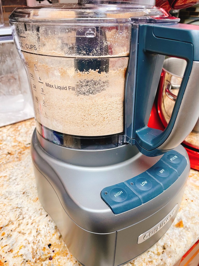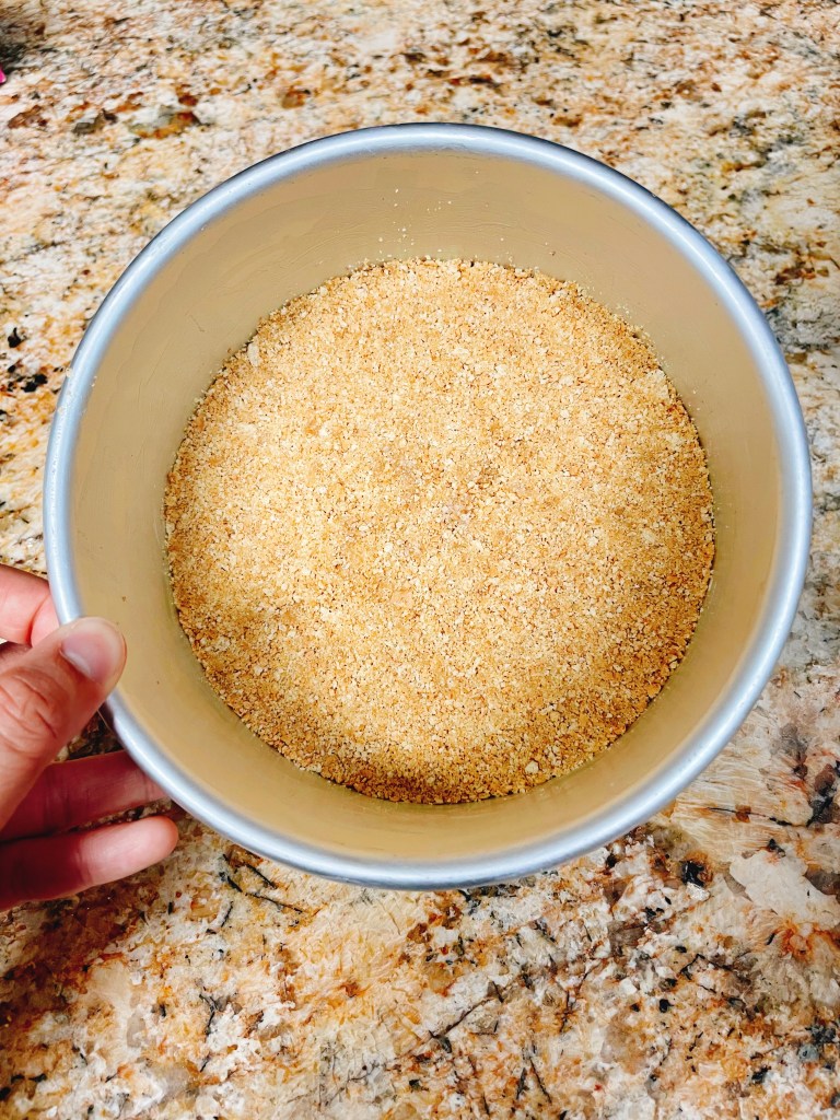 I’ve made this cheesecake before but never with strawberries before. This also came together much more smoothly than the first time I made this. For one, I had a food processor, which made blitzing the graham crackers very easy. Gone are the days of crushing graham crackers in a ziploc bag with a wooden rolling pin. I used a metal-flat bottomed 1/4 measuring cup to press the crust into the bottom of the pan.