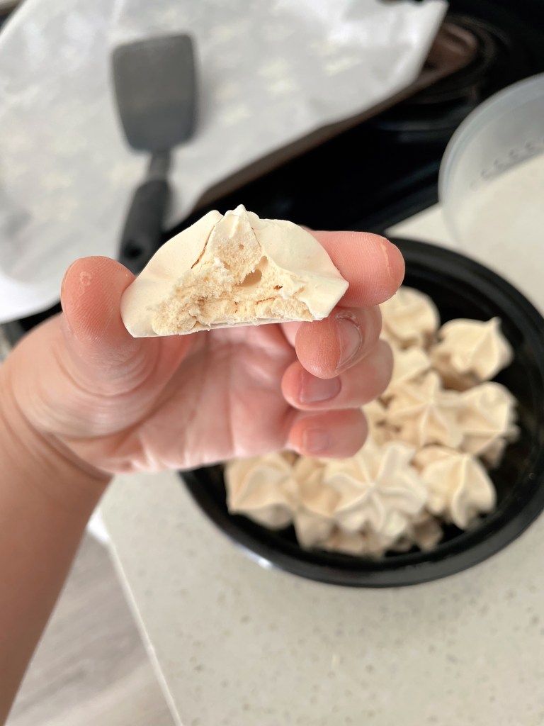I had some leftover meringue and didn’t know what to do with it so I pulled out a piping bag with a star tip and got to work, making roughly ~60 cookies.
