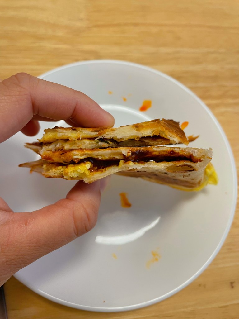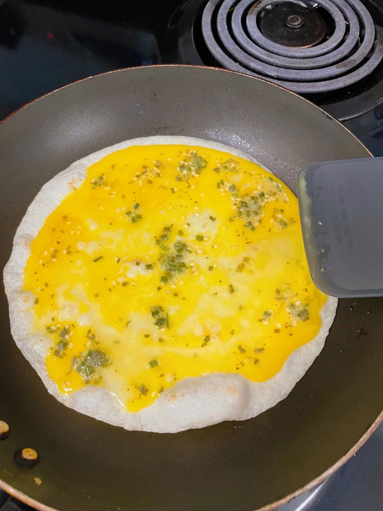 After slapping a tortilla with some oil on the stove, I just whisk an egg and add some cilantro, chives, sesame seeds and a pinch of salt before pouring it over the tortilla. After letting it chill in the pan for a hot minute, I flipped it over for about 20 seconds and flip it back again before slathering some hoisin sauce and chili oil on top. Afterwards, I folded the tortilla into quarters.