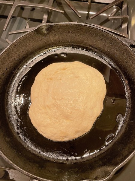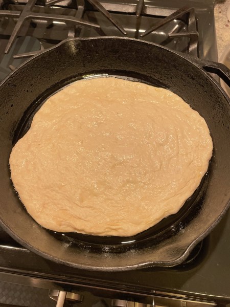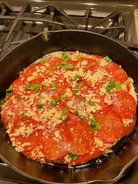 I then oiled up my cast iron and left it to sit there for the second rise. In that meantime, I made the salad and prepared the pizza toppings. Though the recipe said to let it sit for two hours, I became impatient and decided to call it after the first hour. It didn’t quite reach the edges of the pan but after some stretching, I made it sort of work.