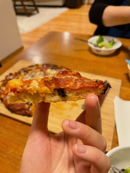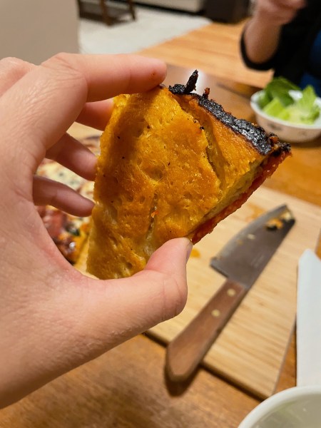The pizza itself tasted pretty good! The crust was crisp on the outside and pretty chewy on the inside. It was definitely pretty foolproof where it was pretty forgiving, even though I didn’t use bread flour and cut the second rise time short. It was pretty satisfying to make this and definitely lived up to its namesake. Given enough time in advance, this could be an easy recipe to plan ahead and execute.