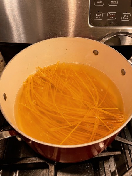 I didn’t read the recipe quite thoroughly so I’ve wasted some time waiting for a pot of water to finish boiling (which took about ten minutes) and dumped the pasta in. The recipe actually mentions to boil 1.5 inches of water in a skillet, not a pot, for less water to boil–it makes water to boil faster and concentrates the amount of starch in the water to be reserved for later.