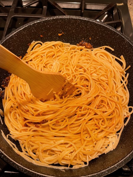 I waited for about 11 minutes (though in hindsight, could’ve boiled it for less time) before using a pair of tongs to transfer the noodles into the garlic sauce at high heat and add in some store-bought shredded parmesan. In hindsight, I should’ve used freshly grated cheese since the shredded parmesan seemed to clump up almost immediately when I started tossing the noodles in the garlic sauce. I ended up supplementing this with some leftover mozzarella cheese from my pizza adventures. The cheese added a gooey aspect to the dish that I enjoyed.