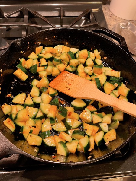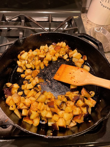 The next step was to cook the vegetables individually. So, I ended up underestimating the amount of time this recipe would take because I thought I could cook everything together but alas, no. For each of the veggies, I cooked it in a cast iron skillet for around 6-8 minutes, seasoning it with garlic, salt, and red pepper flakes. This also marked my first time trying to stir-fry eggplant, which I haven’t done before.