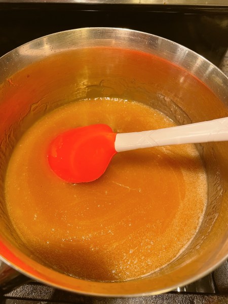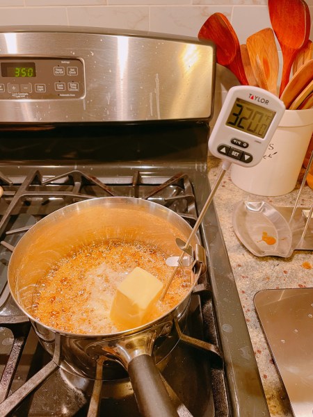 There were a few close calls but I was able to get it to the point where the mixture was able to turn into honey-colored liquid and get the temperature to crank up to 325F (thanks to my shiny new candy thermometer). I then added a stick of butter and stirred it into the caramel until it fully incorporated and let it cool.