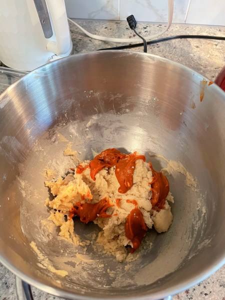 I then popped it in the fridge and resumed making them the next day. My first mistake was forgetting that dough becomes hard when it’s in the fridge and I needed to give it time to soften to room temperature. Because I did not do that, when I proceeded to the next step of swirling the gochujang into the dough, the dough was not pliable enough to be stirred. I ended up putting in some elbow grease and sort-of swirling/digging in the gochujang into the now stiff sugar cookie dough. It definitely did not look as elegant as what appeared in the video.