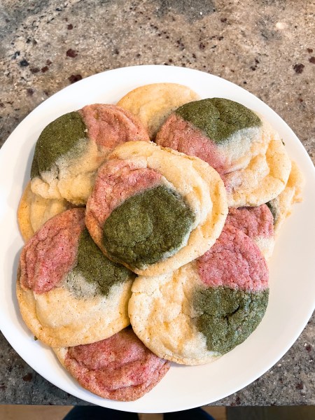 The only change I would make to these cookies would be to scoop maybe 1/2 tbsp, instead of 1 tbsp of each dough to make smaller cookies (or at least, not as giant) or add an equivalent (to matcha and strawberry powder) amount of flour to make sure that each portion would expand and bake the same way.