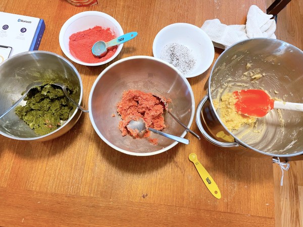 After making the dough, I divided it into roughly three portions–one for original, one for matcha, and one for strawberry. In one portion, I stirred in two tablespoons of matcha. In another portion, I stirred in some freeze dried strawberry powder. I realized, as I’m adding something that is technically dry ingredients, it was pretty hard to mix in the additions into the dough portions to a uniform dough and eventually resorted to the two hand/spoon method to get the job done.