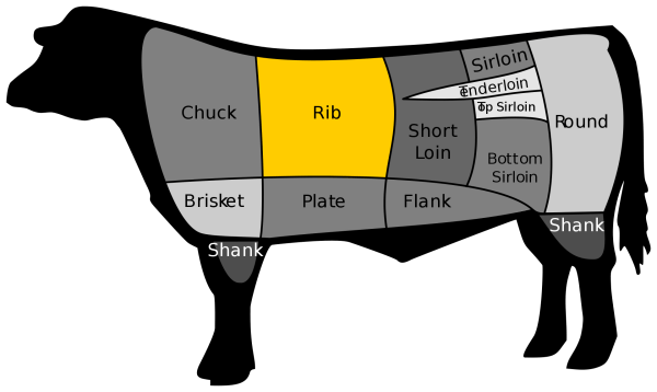 A cow has 13 ribs. Prime rib is the section that covers Rib #6 – Rib #12. This is the loin muscle of the cow, the most tender cuts, second to the filet mignon. It usually contains a generous amount of marbling or fat, which is what we need for juicier, more tender meat.