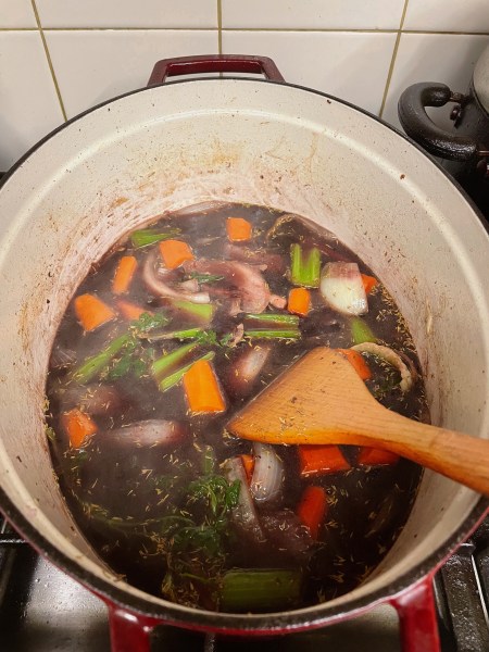 The next day, I started with browning about 2.5 lbs of oxtail bones (decided to just stick with one type of bone, rather than hunt for other beef bones) in a Dutch oven at medium heat (lowered from high when I noticed that things were browning way too quickly) for about 8 minutes, which was shorter than what the recipe called for. I replaced the oxtail bones with my mirepoix (two medium carrots, two ribs of celery, and 1 large onion) along with some bay leaves, thyme, and parsley and browned it for another 8 minutes. I then dumped a bottle of cheap cabernet sauvignon ($2.98 from Walmart, ayy) and reduced it to half and repeated the process with some chicken broth. This will be my jus that I will also be roasting along with my roast.