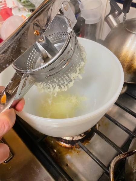 I’ve never seen a potato ricer before in my life. It looks like a giant garlic press and it operates as one.