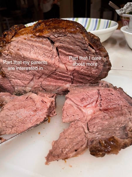 “To you, it’s overcooked. But to me, it’s perfect. Papa and I like our meat well-done,” my mom said as she carved slices off the meat.