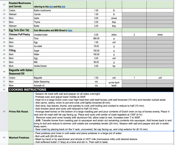 So, I made a spreadsheet for this (thank you, church, for food training), which ended up being pretty helpful since it helped me organize what I needed to get, understand the time and bandwidth needed for each aspect of the meal, and figure out what I needed to start early or can put off till later or what I can even multitask. For example, the roast was something that would require for me to start early but there was so much downtime, waiting for it to roast, where I can work on other things in the meantime.