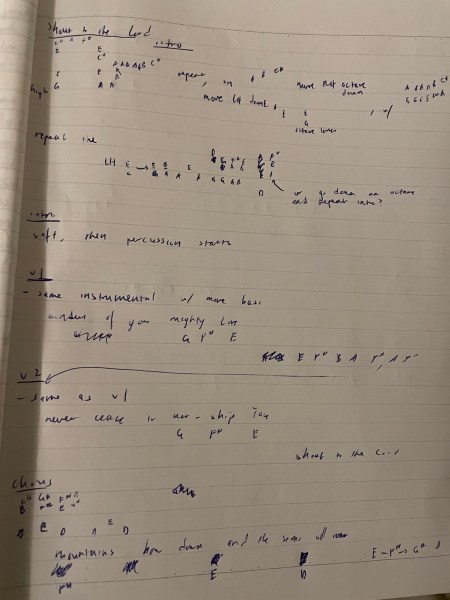 This song was a fun challenge to work out. Unlike other praise or worship songs, there is more of a jazzy/dissonant feel to this cover. It wasn’t as melodic or used as many predictable musical resolutions as the typical praise songs. The use of modern synthetic sounds, bass, drums, and the use of remixing a soundbite from the original song (“Shout to the Lord”), immediately prompted me with the question, “Oh…how do I translate something with these many modern aspects to something that a piano can handle?”