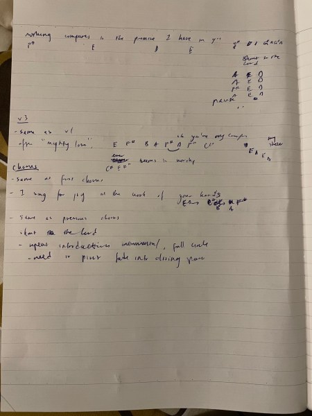 One came up during second round of verse 2 at around the 2:21 mark with the instrumental transitioning into the next part of the verse of “Oh, you’re my comfort”. The many times I had to repeat that part to figure out the timing, because it definitely came on an off beat. Eventually I had to write it out because I could not figure out at what point that would come in.