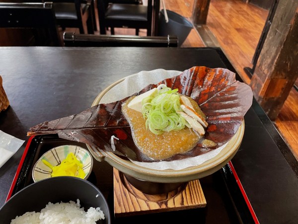 In Shirakawa-go, there is this dish that is served on a dried Hoba leaf and cooked over a flame called Hoba miso. It’s really flavorful and best eaten with rice!