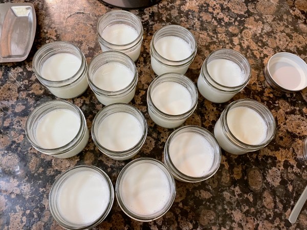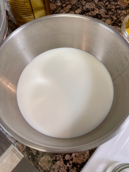 The video depicted carefully decanting heated milk back into a bowl and leaving the milk skin. Because I had about 12 of these jars and I was impatient and most of these didn’t form a milk skin, I poured everything back into a bowl without much care.